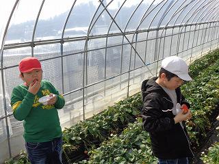 それいけ菊西探検隊 投稿日時 : 2019/02/22 校長 3年生が総合的な学習の時間に校外学習に出かけました。行き先は渡辺いちご園。子どもたちは見学が決まってからこの日を楽しみにしていました。ハウスに着くと、甘いいい匂いがしてきました。子どもたちは思わず歓声を上げます。事前に用意してきた質問を渡辺さんに尋ねました。「おいしいいちごを作るために大切なことは?」「「たくさん収穫できるのはいつ頃ですか?」「ハウスの温度は何度ですか?」「どんないちごが甘いのですか?」「いちごの種類を見分けるにはどうするの?」渡辺さんが丁寧に答えてくださるので子どもたちの質問は終わりません。頃合いを見計らって渡辺さんが「時間があればいちご味見しますか?」「ありがとうございます。」子どもが即答しました。大きくて赤いいちごを口いっぱいに頬張ってみんな満足そうです。次から次へと口に入れる子どもたちに先生が「そろそろ終わりです。給食もあるからね。」「分かりました。じゃあ、あと1つだけ、いやあと2つだけ」お土産までいただき、お礼を言って学校に戻りました。戻ってきた子どもたちはみんな満足そうでした。渡辺さんありがとうございました。