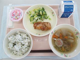 お祝い献立 うれしいね! 投稿日時 : 2019/04/23 校長 入学式から、2週間がたちました。今日の給食は、入学お祝い献立。「祝」の文字のなるとが入った「お祝い吉野汁」「お祝いデザート」などうれしいメニューです。1年生もランチルームで上級生と一緒においしくいただきました。1年生、おいしい給食をもりもり食べて大きくなってね。