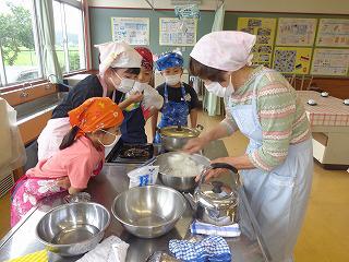 今日は、サマースクールで4~6年生の料理教室がありました。黒川幸子先生をお招きし、「ケークサレ・トマトとレタスのスープ・フルーツヨーグルト」を教えていただきました。グループで、食材を切ったり、炒めたり、焼いたり。みんなでわいわい楽しく作りました。ケークサレには、パプリカ、玉ねぎ、ほうれん草、コーン、ウインナー、チーズ、卵、牛乳が入ります。生地はホットケーキミックス。ホットケーキミックスを使って、こんなに栄養満点の色とりどり鮮やかでおいしいお料理ができるんですね。夏休みにおうちの人と、また作ってみてください。