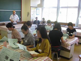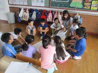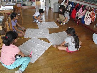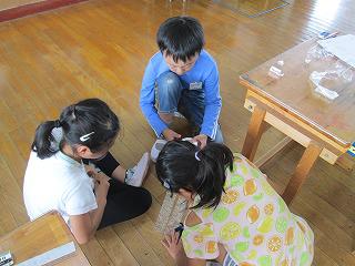 2年生に、「今、授業で一番盛り上がっている勉強は何?」と声をかけると、子どもたちは元気に「三まいのおふだ」と声をそろえました。どうやら、ふれあい学習発表会で発表する計画が進んでいるようです。子どもたちに誘われるまま教室におじゃましてみると、「ねえねえ、顔が見えないから、斜めに立った方がいいんじゃないかな」「ここは4人でタイミングを合わせて練習しておこう」など、友達同士で活発に意見を交換しながら、国語の教科書にのっている昔話「三まいのおふだ」を想像豊かに学習していました。授業の後半は、衣装作りのようです。グループに分かれて「神様は何色にする?」「白」「えっ、白よりは黄色かな」「ううん、もっと違う色がいい」・・・とても楽しそうでした。