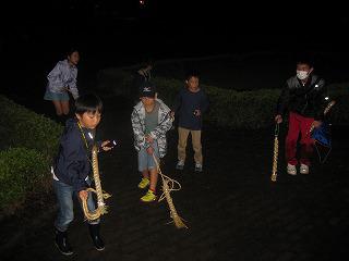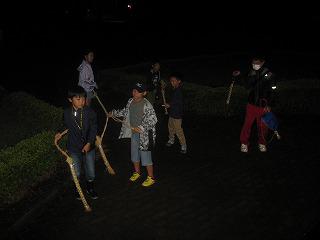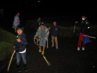 もう真っ暗な時間帯、校庭の方からなにやら子どもたちの声が聞こえます。十三夜のわらでっぽうです。わらで編んだ鉄砲で地面を打ち付け、五穀豊穣を祈る伝統行事です。地中のモグラを追い出すことから始まったとも言われるようです。各家庭をまわって、お菓子やお小遣いをもらうのも楽しみの1つです。しっかりと伝統行事を引き継いでいる地域の良さを改めて感じました。