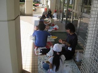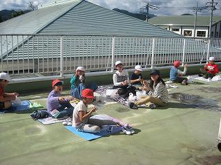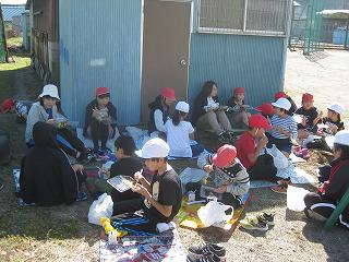 快晴のもと、野外給食が行われました。メニューは、やきそば、たまごやき、ブロッコリー、はらじゅくドック、牛乳です。なかよし班のみんなと外で食べる隠し味が、いっそう味をひきたたせてくれます。おいしく楽しい時間でした。
