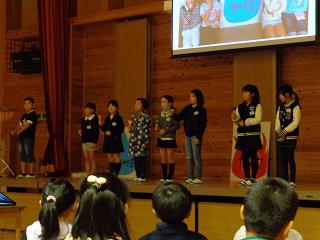 1年生は「にゃーご」というお話の劇。元気いっぱいの大きな声で、会場を笑顔にしてくれました。2年生は「三まいのおふだ」和尚さんのくれたお札からは、漢字や計算の神様が出てきて、クイズを出しました。3年生は、3年生になって初めて習った書道やリコーダーの演奏です。英語歌も上手に披露しました。4年生は、元気にダンスからスタート。スライドで宿泊学習の活動の様子も見せてくれました。5年生は、社会で学んだ日本の漁業についての説明です。かつおの一本釣りが、会場を沸かせました。6年生は、入学から今までの成長を劇にしました。理科の実験や、合奏、歴史上の有名な人物の発表などもあり、さすが6年生と感心しました。地域の方とのふれあいや鼓笛隊の演奏、全校合唱と盛りだくさんの学習発表会でした。学習発表会の後は、学校評議員さんにも子どもたちと一緒に、給食を食べていただきました。この発表会で、子どもたちは、ますます自信をもち大きく成長することができました。天候の悪い中、来校してくださった皆様に感謝致します。ありがとうございました。