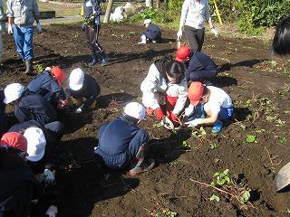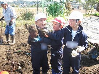 大豊作です! 投稿日時 : 2019/11/14 校長 今日は、1・2年生のさつまいもほりの日です。希望の家の方にも手伝っていただき、まず、つる取り、そしてマルチをはがして、さあスタート。「つるの出ている所を掘るんだよ。」という先生のアドバイスを聞いて掘り始めました。「見つかった!」「こんなに大きいよ。」「さつまいもご飯を食べるんだ。」一輪車3台分の大豊作に、子どもたちは大満足。やきいも、シチュー、さつまいもご飯、天ぷら、スイートポテト。どんなメニューになるか楽しみですね。