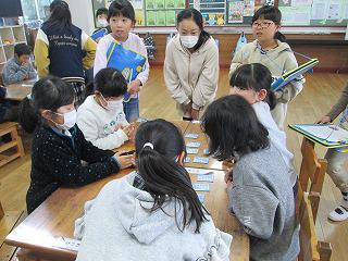 どれに入ろうか、楽しみです 投稿日時 : 2019/11/26 校長 早いものでもうすぐ12月。今年ももう終わりです。来年4月に4年生に進級する3年生たち。今日は、楽しみにしていたクラブ見学です。4年生になると上級生と一緒にクラブ活動に仲間入りする3年生たちは、わくわくしながらクラブ見学に出発しました。難しそうな短歌を読み上げているのは、百人一首クラブです。下の句を聞いて札を探します。「カルタみたいで楽しかった。」「もっとやりたい。」3年生はうれしそうです。おいしそうな匂いがするのは家庭科クラブ。野菜スープを調理中です。あま~い匂いがするのは、科学工作クラブ。べっこう飴づくりを見せてもらいました。ドッジボールに入れてくれたのはスポーツクラブ。上級生の投げるボールに、ドキドキでした。さあ、3年生のみなさん、4年生になったらどのクラブに入るのかな?楽しみですね。