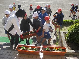 希望の家の皆さんと「花卉イノベーション」 投稿日時 : 2019/11/07 校長 今年も、希望の家の皆さんが、ビオラの苗をたくさんもってきてくださいました。なんてかわいい苗なのでしょう。見ているだけで、なぜだか気持ちがほっこりしてきます。この小さいながらも確かな命を感じさせるたくさんの苗は、希望の家の皆さんが、種から大切に育ててこられたのだそうです。すごい!!感動しました。早速、4~6年生が、希望の家の先生方に苗の植え方を教えていただきながらプランターに植えました。「何色の花がいいかな?」「土はどれくらいかけるの?」「水をたっぷりあげた方がいいね」「そーっとひっくり返してポットから出すんだよ」みんなでわいわい言いながら植え、かわいがって育てることを約束しました。花を植える子どもたちの表情の柔らかなこと!!みんなで幸せな一時を共有することができました。