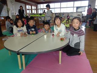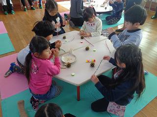 入学式に待ってます 投稿日時 : 2019/12/09 校長 今日は、来年の4月から1年生になる年長さんが、学校参観に来ました。1年生と一緒に生活科で、松ぼっくりツリーを作りました。ビーズをモールに通して飾りを作り、素敵な松ぼっくりツリーの完成です。その後、1年生の作った松ぼっくりけん玉や、どんぐりめいろで遊びました。4時間目が終わると給食です。ランチルームで全校一緒に食べます。今日のメニューは、スパゲティミートソースと大根サラダ、ドーナツです。年長さんは食欲旺盛。「たくさん食べてくれました。」と調理員さんも大喜び。最後に全校生からの歌のプレゼントを聞き、1年生と握手をしてさようならです。年長さん、学校は楽しかったですか。入学式に元気に来てくださいね。