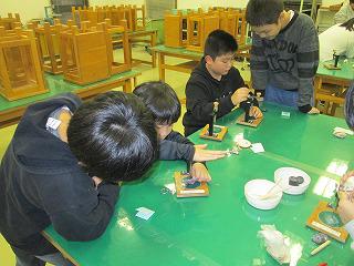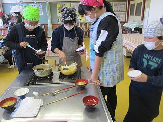 おいしく炊けました 投稿日時 : 2019/12/12 校長 今日は、5年生の調理実習です。ごはんと味噌汁を作りました。普段は炊飯ジャーでスイッチ一つで炊き上がるご飯。今日は、ガラス鍋を使って、米から炊ける様子を観察です。「もう中火かな?」「こげくさい!弱火弱火」と時間と火加減に注意して、わいわい言いながら炊いていきます。味噌汁は、にぼしの頭とはらわたを取って、だし汁を作ります。ふっくらおいしく炊き上がったご飯、少しおこげのついたごはん。グループによってそれぞれにおいしいご飯が炊けました。温かい味噌汁と合わせて、給食の後なのに完食してしまいました。