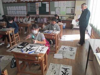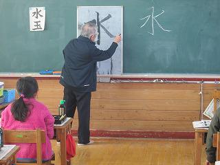 今日は、3年生の書道を教えていただいた、ボランティアティーチャーの森先生の最後の授業でした。森先生には、4月から筆の持ち方や正しい姿勢など基本的な内容を教えていただきました。初めての書道では「二」の漢字から始まり、最後に書く漢字は「水玉」です。「水」という漢字は、はねや左はらい、右はらいなど今まで学習した筆遣いが、すべて入っている難しい漢字です。森先生は、授業の前日には、何枚も練習し筆遣いなどの大切な部分を教えてくださいます。子どもたちは、毎回熱心に取り組み、一年間で大変上達しました。森先生、丁寧なご指導、大変ありがとうございました。
