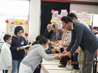 今日は、一年間、本校の教育活動にご協力いただいたボランティアの皆さんを招待し「感謝の会」を開きました。学校の花壇を気にかけ、きれいな花を提供してくださる自治会長様を始め、農園ボランティアの方や登下校の見守りをしてくださる方、地域のボランティアをつないでくださるコーディネーターの方、環境整備の方、読み聞かせや季節ごとの図書室飾りを作ってくださるKLVの方、希望の家の方など、学校ではたくさんの地域ボランティアの方の協力で、子どもたちの豊かな活動が支えられています。本当に感謝です。代表の児童が、一人一人に手紙と花束を渡し、全校で「ありがとうの花」を歌い、感謝の気持ちを伝えました。これからも地域ボランティアの方の温かいご支援の下、地域の特色を生かした教育活動を続けていきたいと思います。ありがとうございました。
