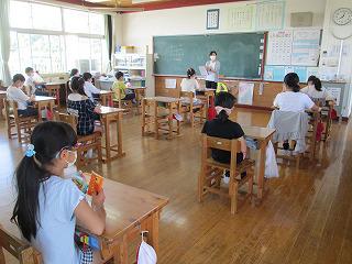 長い臨時休業、そしてここ数日の暑さの影響もあり、児童の健康状態が大変気になります。生活のリズムを取り戻し、児童の体調の回復等を考え、3日間は臨時日課(5時間授業)とします。児童は給食を食べ、午後2時に一斉下校となりますので、よろしくお願いします。4日(木)からは、通常の授業に戻したいと考えておりますので、ご協力のほど、よろしくお願いいたします。