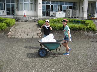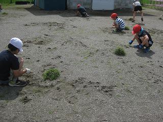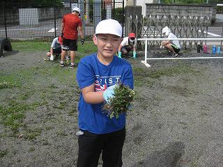 明るい笑顔が増え、元気なあいさつが響くようになってきました。元気を取り戻してきた子どもたち以上に草は元気です。今日は、全校生で除草を行いました。「お友達との距離を1メートル開けて、みんなでがんばりましょう」という校内放送を合図に、子どもたちは暑さに負けることなく一生懸命に取り組みました。「なかなか草がとれない。」と苦労したり、「根っこがゴボウみたいだ。」と驚いたり、「こんなに取れたよ。」とうれしそうに見せにきたり、「たくさんあるからこっち手伝ってー。」と声をかけたり、子どもたちは様々な表情を見せました。体験を通して、働くことの大切さや大変さ、楽しさ、協力することや人との関わり方など、数多くのことを学び、身に付け、成長していきます。