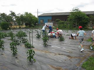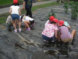 なんと! 農園に張ったマルチにできた水たまりに、たくさんのおたまじゃくしがいるではありませんか! おたまじゃくし救出大作戦がはじまりました。