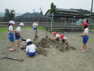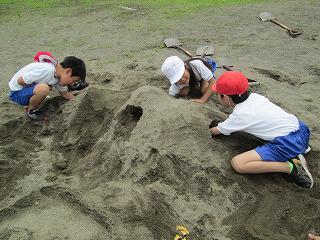 2年生は、図工。砂場で裸足になり、砂山やトンネル、お城作りに夢中です。「先生、トンネルから手が見えます。」「裸足になっちゃいました。」と楽しそう。裸足になって感じる砂の感触、気持ちよさそうです。土や砂を手で握ったり、裸足で踏んだりして、感触を楽しみながら創作する学習です。