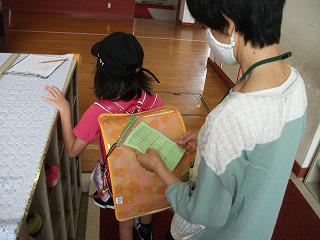 朝の体温・健康チェックを昇降口で行っています。健康チェックカードをランドセルにぶらさげ、はさめるように工夫しました。すぐにチェックができ、密にならずにスムーズに教室に入ることができます。