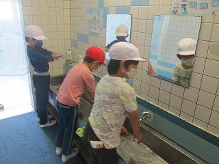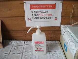 放課後は、机、ロッカー、手すり、スイッチなど、多くの児童や職員が手を触れる場所を消毒しています。また、昇降口には消毒液を用意していますので、ご来校の際はご使用いただき、感染症対策にご協力くださいますようお願いいたします。
