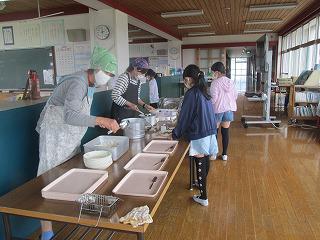 給食の配膳は、先生方が行っています。各教室に分かれ、前を向いておしゃべりを控えて食べています。給食を少しでも潤いのある時間にと、音楽を流しています。