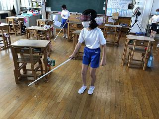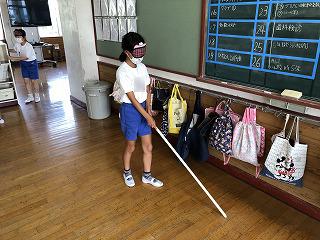 5年生は、総合的な学習の時間で「福祉」について学びます。目や耳の不自由な方、高齢者の方について知り、自分たちにどんなことができるか考えていきます。なかなか自分のことに置き換えるのが難しい内容ですが、少しでも、体験を通して知ることができればと、まずは点字体験です。自分の名前を小さな点で打っていきます。子どもたちは、「こんな小さい点を指で読むなんてすごい!」と驚きの声。次は、アイマスクをつけて、白杖を持って歩いてみます。「まっくらの世界ってこわい」「普段生活している教室は、なんとなくわかるけど、初めての場所では歩けないかも」など、様々な感想をもちました。