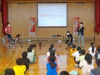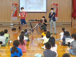 今日は、宇都宮ブリッツェンの方に、自転車のマナーやルールについて教えていただきました。アジアチャンピオンの小野寺選手も来ていただき、楽しくレースのお話なども聞かせていただきました。選手の自転車は、スピードを競うものですが、私たちが普段使う自転車は、ちょっと遠いところに行くためのもの。だから、安全が第一です。自転車は、車の仲間。だから車道を通ること。でも、13歳未満の子どもと70歳以上の方は、歩道でもいいのだそうです。でも、歩道は歩行者優先。スピードを出してはいけないこと。歩道を乗るときは、道路側を通ることなど、大切なルールについて、DVDを見ながら分かりやすく教えていただきました。実技では、両手でブレーキをかける練習をしました。子どもたちは、中学生や高校生になると、自転車に乗る機会が増えてきます。これからもマナーを守って安全に乗ってほしいです。