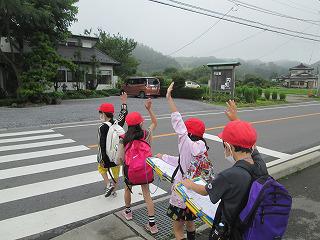下校時は、間隔を十分にとって並びます。歩くときも間をあけて歩きます。