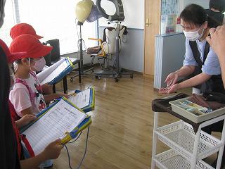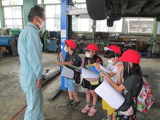 そば屋さんでは、蕎麦打ち名人に会いました。パン屋さんでは、朝の3時半から早起きするパン屋さんにびっくり!パーマ屋さんでは、いろいろな種類のはさみを見せていただきました。消防分署では、救急車に乗り、心拍数と血液中の酸素量を測ってもらいました。駐在所では、5キロの重さの防弾チョッキを持ってみました。指紋のとり方も教えてくださいました。地域のお店屋さんでは、店内を案内していただき、質問に答えていただきました。自動車工場では、車を安全に走らせるためのお仕事がいっぱいあることを勉強しました。工場にはいろいろな道具がありました。