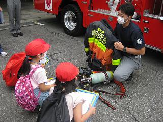 今日は、2年生が生活科で町探検です。学校の周りには、消防分署や駐在所、パーマ屋さん、そば屋さん、パン屋さん、小売店、自動車整備工場など、いろいろな施設やお店があります。初めて行く場所もあり、わくわくドキドキ、ちょっと緊張気味の子どもたち。