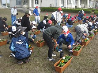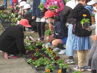 例年なら、さつまいも掘りや運動会など、希望の家の方との交流ができていたところですが、今年度は、コロナウイルス感染症対策のため、なかなか交流ができません。そんな中、市の事業「花卉イノベーション」で久しぶりの交流活動です。4~6年生と希望の家の方とで、パンジーの苗を植えました。