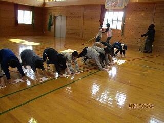 卒業式まであと13日。みんなで学校で過ごすのは、あと9日です。今日は、ピカピカの体育館で卒業式を挙げてもらおうと、休み時間を使って4・5年生が体育館の水拭きを、職員がワックスがけを行いました。子どもたちはおおはりきりで、なんと、みんなで並んでぞうきんがけを始めました。「1、2、1、2、!」子どもはなんでも楽しんでしまう天才です。あっという間に、ピカピカの体育館になりました。着々と、卒業式に向けて準備が整っていきます。嬉しいような、淋しいような・・・