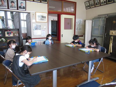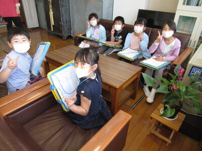 今日は、1年生と2年生が学校探検の中で校長室にやってきました。「失礼します。〇〇〇〇です。学校探検にきました。よろしくお願いします。」なんて礼儀正しいのでしょう。手には手作りの名刺まで持っています。部屋の中をそーっと見まわし「うわあ、初めて入ったあ」とにっこり。子どもたちは、どうやら歴代校長のたくさんの写真とソファーと古い大きな金庫と職員室に通じるドアが気になるようです。楽しい会話がとまりませんでした。
