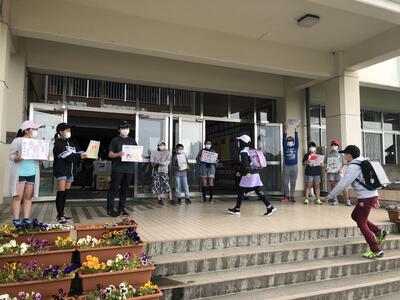 代表委員さんたちが、昇降口で朝のあいさつ運動を始めました。「おはようございます!」子どもたちの元気な声が響きます。手には、手作りの啓発ポスターをもっています。ゴールデンウィークあけにもかかわらず、心弾む朝です。