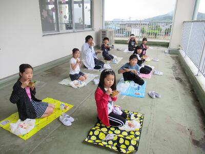 今日は、今年度初めての野外給食がありました。昨年度は、新型コロナウイルス感染症のため実施できなかったので、久しぶりの野外給食です。あいにくの小雨模様でしたが、なかよし班ごとに、体育館への通路や各階のオープンスペース、ベランダなどで、ピクニック気分で給食をいただきました。感染症対策をとって、食べながらのおしゃべりはできませんでしたが、いつもとは違った給食に、みんなにこにこ笑顔で味わっていました。次の野外給食は、青空のもとで食べられるといいですね。
