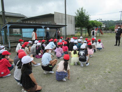 今年度初めての避難訓練を実施しました。大地震とそれに伴う火災を想定した避難訓練です。地震から身を守る行動と大きな建物の中にいるときの避難の仕方の学習です。