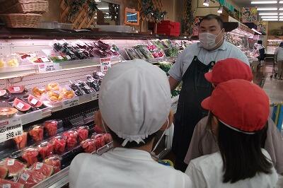店長さんと一緒に、店内や普段見ることのできない裏側もじっくり見学させていただきました。実際に野菜や肉、魚をカットしている様子を見て、子供たちは大興奮でした。