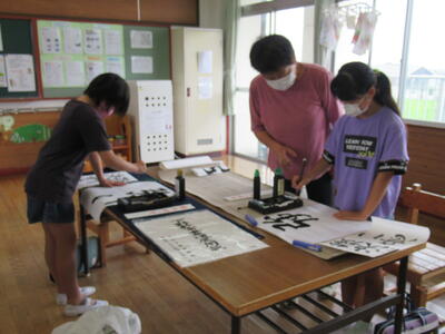 そして今年は、サマースクールも復活しました。初日は、地域にお住まいの菅沼久子先生をお招きしての書道教室です。3・4・5年生の6名が、下野教育書道展に出品する作品に取り組みました。今回の課題は東京オリンピックに因んで「新たな挑戦」。子どもたちはそれぞれ真剣に白い紙と向き合って、「もえる心」「学びの力」「強い決意」を表現していました。菅沼先生はそんな子どもたちに、字の大きさや太さ、筆遣い、バランスのとり方など、細かなご指導をしてくださいました。先生のご指導によりすばらしい作品が仕上がり、子どもたちはやり切ったという充実感いっぱいの教室になりました。