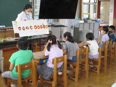 1・2年生と3年生を対象にして、図書支援の先生に、読み聞かせをしていただきました。みんな「はらぺこあおむし」の大型絵本に夢中です。身を乗り出して見入っています。思わず「うわーっ」なんていう声も!読み聞かせの後は、図書室に行って、本を返したり、借りたり、手に取って読んでみたりと、思い思いの読書の時間を楽しみました。
