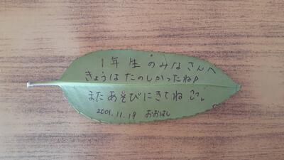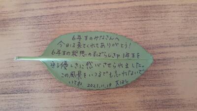 大橋様から、タラヨウの葉っぱに書いたあったかーいメッセージが届きました。感動です。