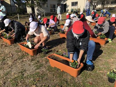 希望の家の皆さんが、種から大切に育ててこられたかわいいビオラの苗を、今年もたくさんいただきました。早速、4~6年生の子どもたちが希望の家の皆さんと一緒にプランターに植えました。植え方のコツを教えていただきながら、優しく丁寧に植えました。代表児童が「希望の家の皆さんが心を込めて育ててくださったビオラは、今日から私たちが大切に育てていきたいと思います。」と力強く挨拶。心の中まで可愛い花でいっぱいになるようなうれしい時間でした。