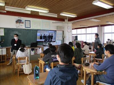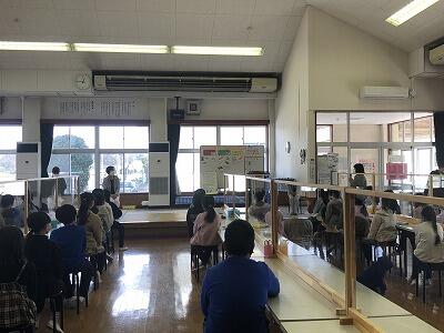 卒業式まで、みんなで過ごす日もあと8日となりました。今日は、北中学校からお二人の先生がみえて、北中学校の様子と中学校への心構えのお話をしてくださいました。北中学校の生徒さんが制作したという映像にも、子どもたちは身を乗り出すように見入っていました。6年生の意欲は満点!もうすぐ希望の春です。全校そろって、元気に、充実した学年末が過ごせますように。