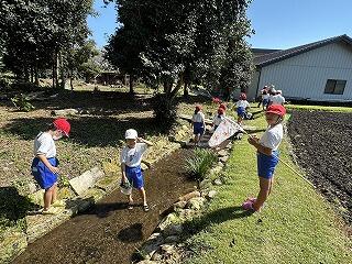 2年生は生活科「めざせ 生き物はかせ ~ぞう木林をたんけんしよう~」として、3年生は総合的な学習の時間「雑木林から地域の自然を学ぼう」として、大橋様所有の雑木林を中心に、蓮の池や用水路などで活動させていただきました。雑木林の中には、大橋様や地域の方が手作りされたすべり台やブランコなどの遊具もあります。生き物探しをした後は、柔らかな日差しが降り注ぐ中、その遊具でも遊ばせていただきました。