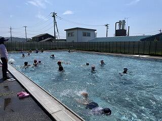 暑さを吹き飛ばす水泳学習!元気に水の感触を楽しみながら、泳いだり水遊びをしたりしています。プールから出た後は、みんな一様に「気持ちよかった!」と笑顔で校舎に入ってきます。