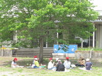 新緑と輝く太陽のもと、今年度初の野外給食を実施しました。事前に話し合った場所にレジャーシートを広げて、なかよし班の子供たちと先生が一緒に、野外給食メニュー(焼きそば、ボイルブロッコリー、カレー風味ちくわ天、マフィン)を味わいました。気持ちの良い外での給食は格別でしたね。