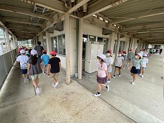 その後、大雨の影響で黒川が増水したという想定で、全員体育館へ避難しました。体育館への移動も整然と、素早く行うことができました。校長からは、災害はいつ起こるか分からないものであること、特にゲリラ豪雨は、最近全国各地で起きていることを伝え、増水した河川やアンダーパスで命を落としてしまう人もいることを話しました。いざという時、自分の命は自分で守れるよう、様々な状況で取るべき行動を考えさせました。