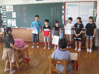 朝は、あいさつリーダーさんの爽やかな「おはようございます」の放送で一日が始まります。そしてすぐに、リーダーさんが二班に分かれて、各教室に元気なあいさつを届けに行きます。「おはようございます!」と声をかけると、教室の子どもたちも少々はにかみながら「おはようございます」と応えています。先生たちも、リーダーさんの活躍を笑顔でバックアップしています。