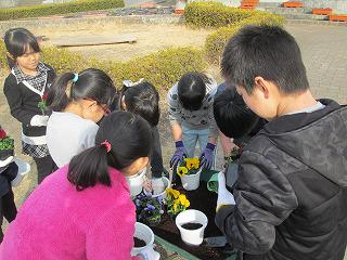 にこにこ笑顔で 投稿日時 : 2019/03/02 校長 緑の少年団からパンジーが届き、3・4年生で植え替えをしました。はじめに土と腐葉土を混ぜることからはじまり、そして、植木鉢に植え替えました。終始にこにこ笑顔で、とても楽しそうに取り組んでいました。やっぱり花っていいですね。