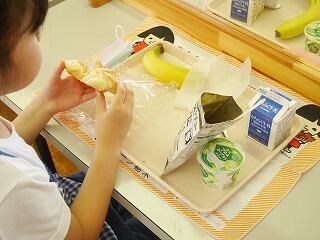 袋から直接食べるのに苦労しながら、でも、工夫して1年生も上手に食べていました。不自由さを感じながらも、感想を子どもたちに聞くと「シチューがおいしかった‼」と好評でした。クロワッサンも、冷凍したものを解凍して食べましたが、しっとりしていてとてもおいしかったです。