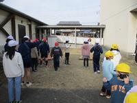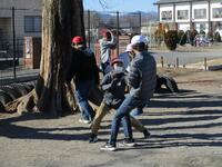 国旗掲揚塔の前では、6年生が5年生に「国旗掲揚の方法」を教えていました。
