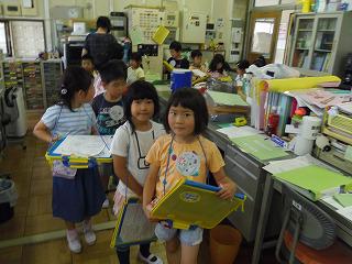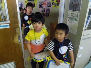 1年生の学校探検がありました。前回に続き、今回は決められたミッションを達成するために、子ども達は班ごとに学校を探検しました。職員室や保健室・音楽室などを回り、プリントに書かれた問題を解いていきます。職員室では出入りの仕方を教わり、上手にできるようになりました。「先生は全部で何人ですか」という問いの答えを聞き出し、プリントに書き込んでいました。2時間かけて学校を回りました。
