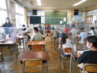 給食中の様子です。全員が前を向いて食べたり、飛沫防止ガードを活用したり、おしゃべりしないで食べたりするなどして、感染症対策をしています。