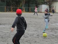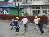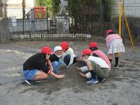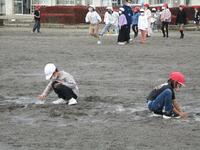 校庭にはまだ水たまりがありました。子どもたちは、水たまりをよけながら巧みに遊んでいました。