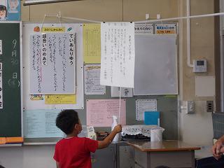 昨日までの暑さが嘘のようで、今日はよいお天気ではありますが、吹く風も心地よく、過ごしやすい一日となっています。校庭では子どもたちが元気に体育を行っていました。しかし、気温はまだしっかり30度を超しており、水筒の準備は忘れられません。